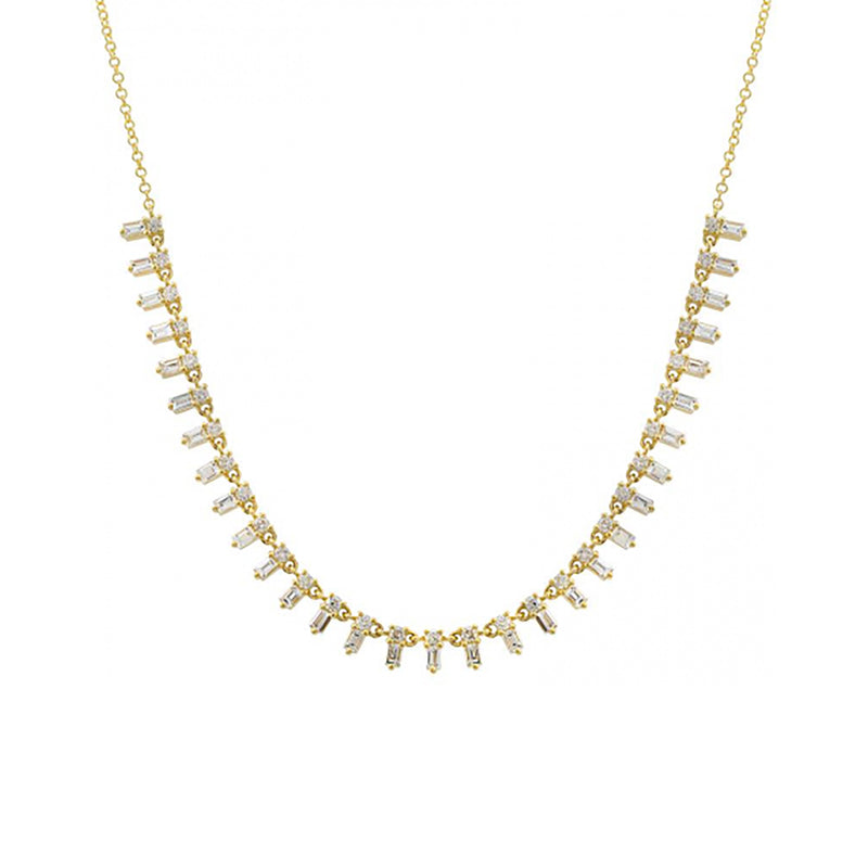 14k yellow gold baguette and round brilliant diamond necklace, 0.39ct round diamonds, 0.71ct baguette diamonds, 17 inches with adjuster