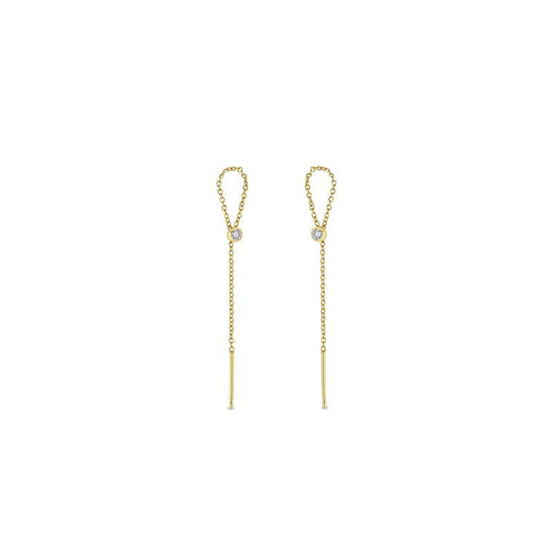 14k yellow gold cable chain threader earrings with a bezel set round diamond at the end of the chain with a threader opening set behind the diamond weighing 0.10tcw. Chain is threaded through ear and looped down through the opening in the back.