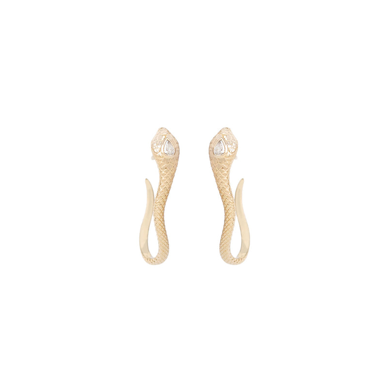 14K yellow gold Cobra Pear Diamond Earrings containing 0.09tcw pear cut diamonds. The cobra represents reincarnation, immortality, and purity. Priced as pair.