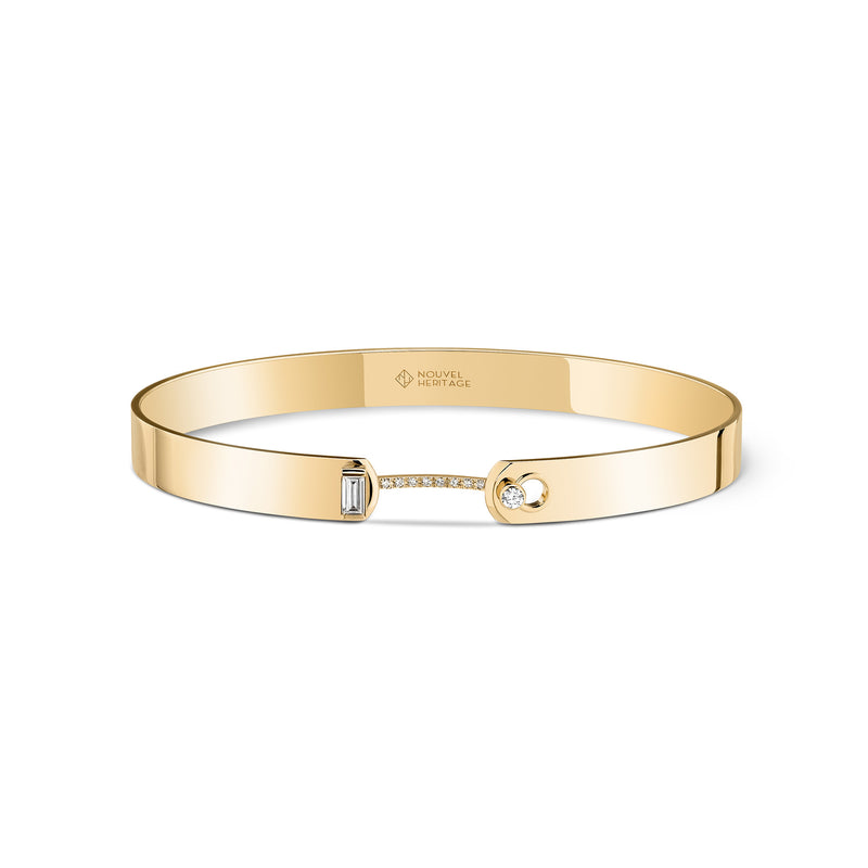 Simultaneously minimalist and precious, this bangle is a slightly wider take on the iconic Dinner Date Mood bangle which revisits the baguette-cut diamond in an ultra-modern way. Drawing inspiration from the aesthetic codes of the punk movement, it revisits the piercing as its signature closure set with a delicate line of brilliant-cut diamonds and a baguette-cut diamond. An everyday statement, the 18k gold bracelet is crafted to the highest standards of French savoir-faire with a subtle oval shape that is as chic as it is comfortable, making it easy to wear alone or mix with other favorites. Collection: Mood Material: 18-Karat Yellow Gold Diamond Quality: F-G VS Carat Total Weight: 0.19 Measurements: 0.24" wide (6mm) Clasp: Pinch sides to unhook the piercing