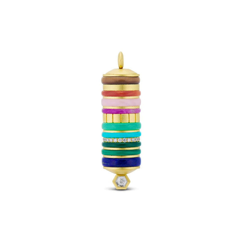 18k yellow gold, diamond and semi precious stones Wayfinder pendant made with interchangeable beads. This pendant is inspired by the stacking stones used to mark a trail. Its foundation piece features a hexie diamond. *This Follow the Sun Wayfinder is sold as a complete set. Individual beads include: -2 half Rays Knife Edge -Follow the Sun Bead