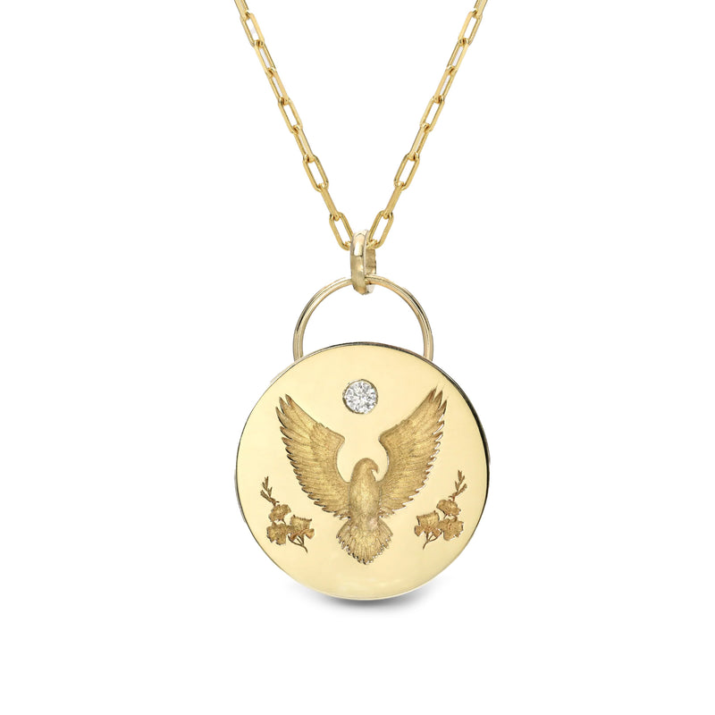 The Alchemy Collection represents transformation and creation. Transformations are big and small. These pendants represent virtues that remain constant through transformation. The eagle between gladiolus represents honor and strength of character. A reminder to do the right thing no matter whether you will be recognized for it. This pieces features a 14k yellow gold padlock medallion with a 0.10ct white round brilliant diamond. Pendant diameter is 24mm. The 30" chain is solid and can be detached from the pendant.