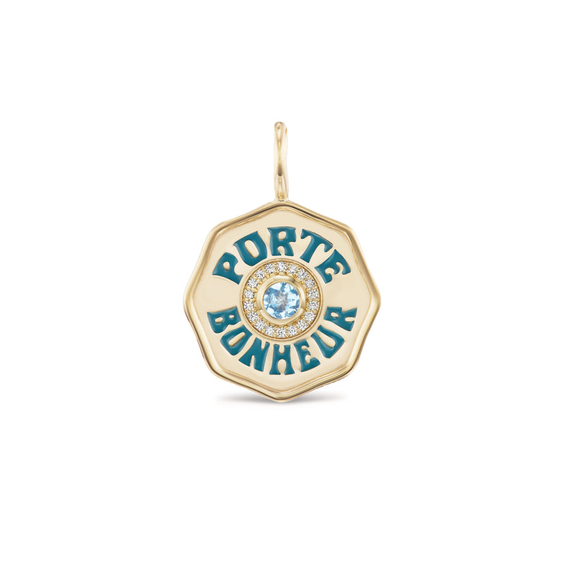 A stunning gold talisman to carry with you, wherever you may go. Our Large PB Charm features a bezel set faceted stone, surrounded by a white diamond halo. The teal hand-painted enamel inscription reads 'Porte Bonheur', French for luck and good fortune.