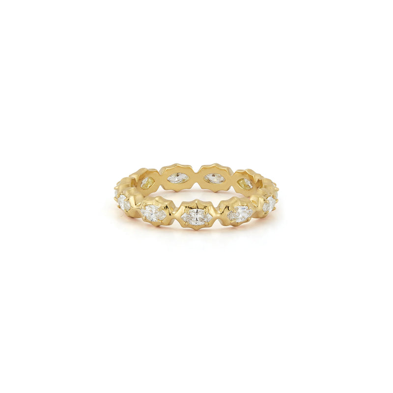 A whimsical play on the classic eternity band, the Maverick Eternity Band features 11 x east-west, marquise cut diamonds mounted in our signature Alchemy prong setting all the way around the ring. 18K Yellow Gold, 0.66 total carat weight, size 7, made in New York