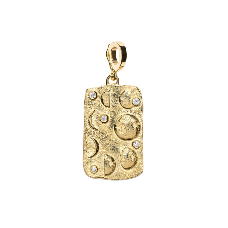 Inspired by the lunar phases, this coin symbolizes the cyclical nature of life and the constant potential for renewal and transformation. Just as the moon moves from darkness (new moon) to fullness (full moon) and back again, it reflects lifeβs rhythms of beginnings, growth, release, and rebirth. 27mmx19mm Coin; Made of 18K Yellow Gold & .04ct White Diamonds This coin comes on a charm clasp. Meaning the clasp opens and closes and can be taken off or put on any chain.