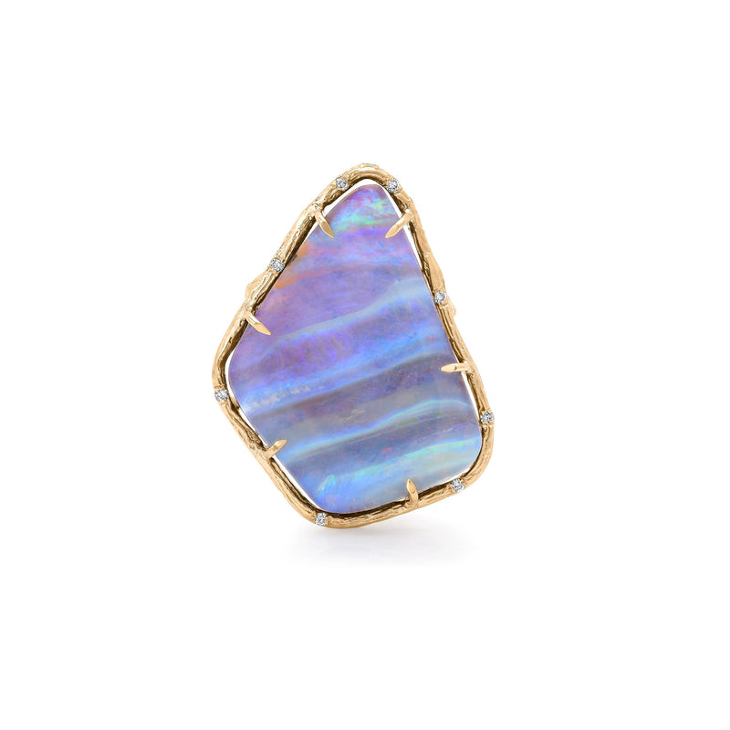 One of a kind Australian boulder opal has the most unique pattern and flashes of green, blue and purple. Wrapped in our 14k yellow gold willow branch wire with diamonds, you can see ancient fossilized wood emerging from beneath the lilac hue. Opal measures 1.25x1 inch, size 6.5.