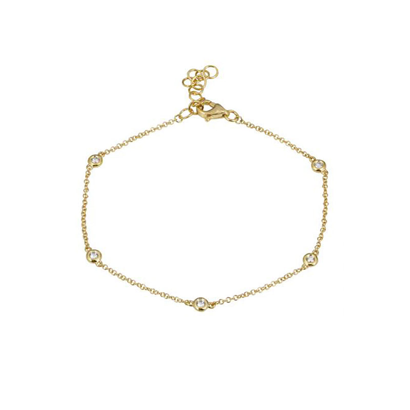 14k yellow gold bezel set five diamond bracelet, 0.11ct round diamond, lobster clasp, 7 inches with adjuster
