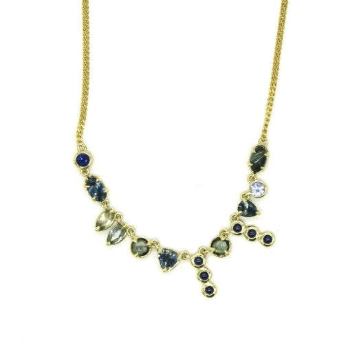 18k yellow gold Blue Jean Baby riviera featuring mixed cut sapphires and tourmalines on micro curb chain measuring 18"