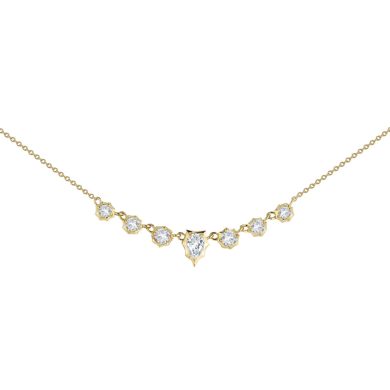 18K yellow gold Small Envoy Necklace containing 0.70tcw round graduated diamonds and pear shaped diamond, 18" adjustable length.