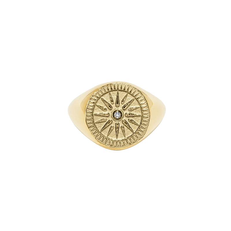 18K yellow gold Sunburst Coin Ring containing 0.01tcw diamond.