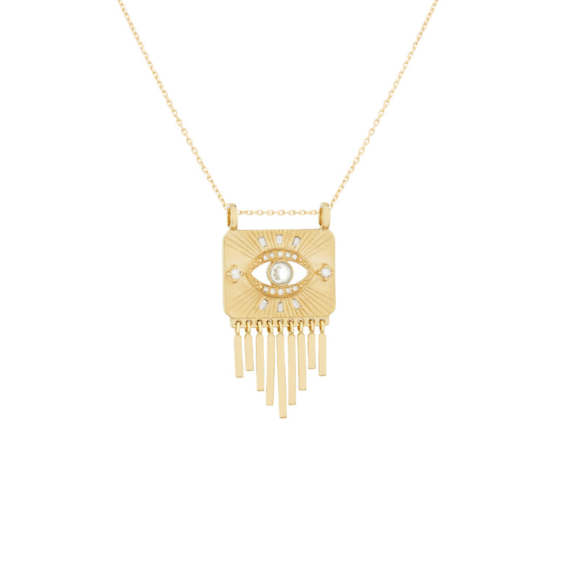 14k yellow gold plate pendant with diamond eye center, white sapphires, and gold bar dangling detail. The totem is a protective tailsmand and lucky charm. It is a symbol of spirituality and strength.